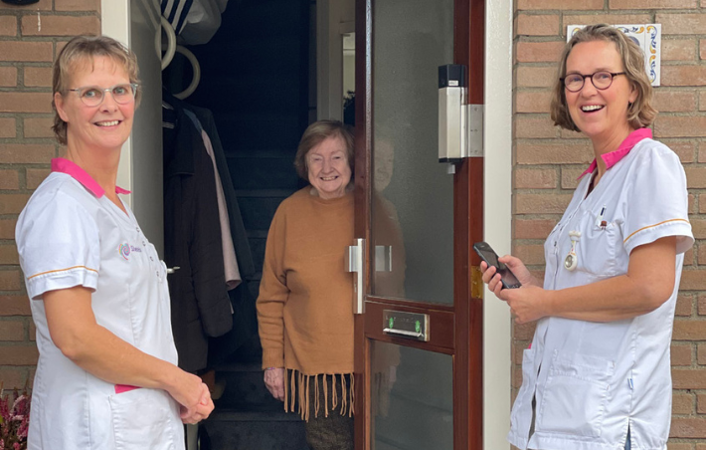 Zo verlenen ze ook zorg bij mevrouw Barrau. Twee keer per dag komt Zorg thuis bij haar langs om te helpen met de zorg die zij nodig heeft. Mevrouw Barrau lacht naar Elize en Nynke: “Dankzij jullie kan ik zelfstandig thuis blijven wonen.” Elize benadrukt dat ze mevrouw Barrau zoveel mogelijk zelf laten doen: “Wat echt niet lukt, nemen wij over. Zo houdt ze zelf de regie. Dat maakt het werk ook zo leuk; wij komen echt op bezoek. Bovendien is het achter elke voordeur weer