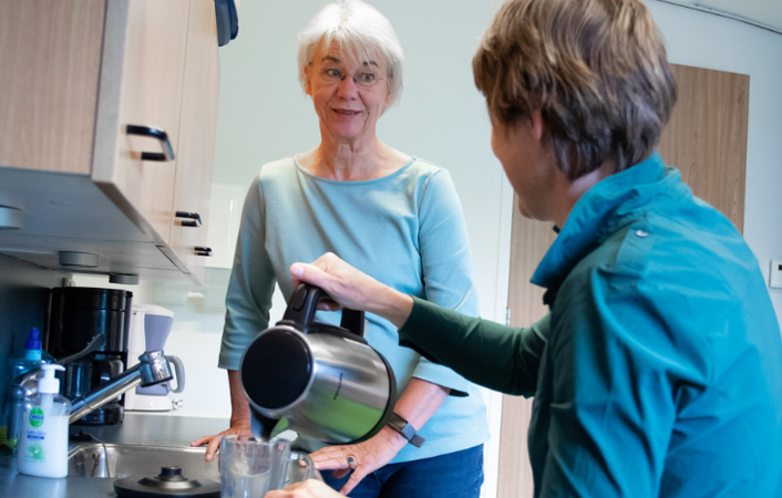 Voor wie langer thuis wil blijven wonen, heeft ze praktische tips. “Preventie is het toverwoord. Oftewel: voorkomen is beter dan genezen!” In de oefenkeuken in Birkhoven Park legt ze dit uit. “Kijk kritisch rond in je huis. Hoe veilig is het? Hoge drempels, drangers op de deuren en een diepe afstap naar het balkon: dat zijn allemaal risico’s voor wie minder stevig op zijn benen staat. Je kunt ook bij het aanrecht gaan zitten, in plaats van te blijven staan. Dan kun je veilig heet water in een beker schenken. Zo zijn er meer slimme trucjes. Als je minder goed of scherp ziet, zorg dan voor betere verlichting. Losse kleedjes zijn riskant, want je kunt er makkelijk door struikelen of over uitglijden. Kies stoelen met armleuningen: daar kun je veiliger in gaan zitten en uit opstaan. Gebruik je medicijnen, let dan op de bijwerkingen. Van sommige pillen kun je duizelig worden. Mensen denken eigenlijk te laat na over ‘later’. Dan is het moeilijk om nog te verhuizen.”