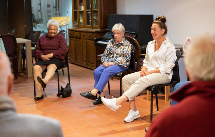 “Iedereen vergeet wel eens wat”, vat Monique het samen. “Zo gaan we hier om met dementie. Hier tel je mee, je bent van waarde. De jongste deelnemer is 59, de oudste 93. De mensen raken gehecht aan elkaar, ze helpen elkaar. Of iemand nou dementie heeft of psychische klachten. Alles mengt zich.”
