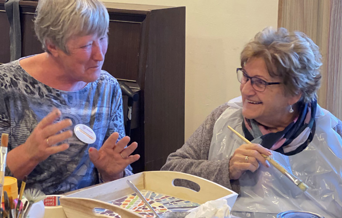 Majo vertelt: “Als vrijwilliger hoef je niet veel kennis te hebben. Als je iets niet weet, vraag je om hulp.” Mevrouw Kuijt versiert vandaag een dienblad met mozaïek. Ze lacht: “Die is straks voor mijn dochter.” Er hangt een gezellige sfeer; kopjes koffie staan op tafel en er klinkt muziek op de achtergrond. Majo wijst naar een cliënt die stukjes in een houtwerk plaatst: “Daar heeft die meneer voor gezorgd. Hij heeft afasie, kan daardoor niet praten en vindt het fijn om de muziek te regelen.” Het is duidelijk dat ’t Atelier om meer draait dan alleen creatief bezig zijn. Majo vertelt: “We hebben wel vrijwilligers nodig, zonder hen kunnen we dit niet doen. Iedereen is welkom.”