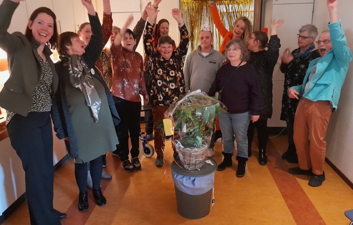 Regiomanager Harmke Kuijvenhoven is vol lof over de samenwerking: “De inzet van Amerpoort-cliënten helpt ons enorm. Hun vrolijkheid en pure eerlijkheid zijn verfrissend en gezellig. Ze worden door iedereen gewaardeerd, zowel door bewoners als medewerkers. We vinden het fantastisch dat zij alweer 5 jaar bij ons aan de slag zijn!” Als cadeau gaf ze een vingerplant: elk blad staat voor de helpende handen van het KlusPlus-team.