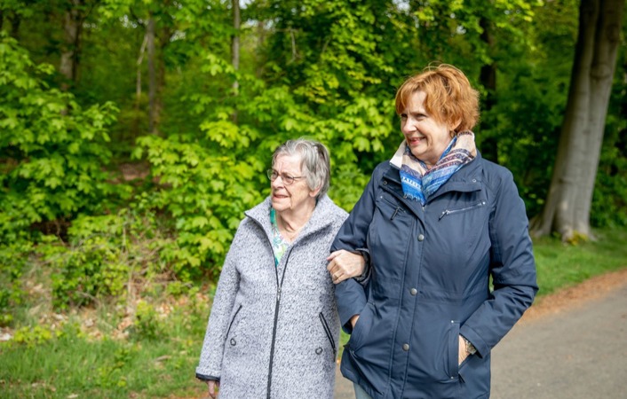 Samen wandelen is toch gezelliger. De meeste bewoners zijn afhankelijk van een vrijwilliger om naar buiten te gaan en te genieten van het weer.